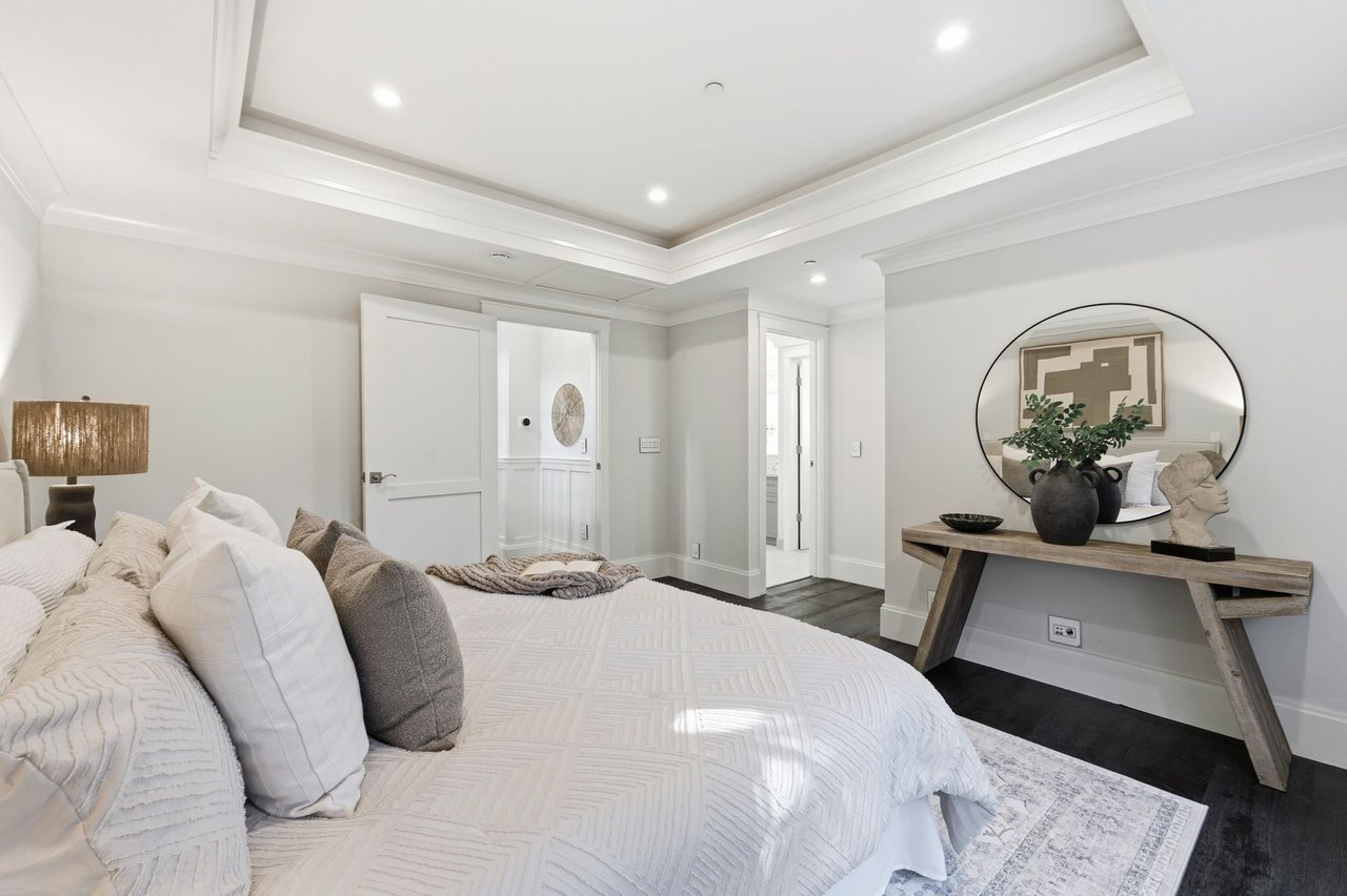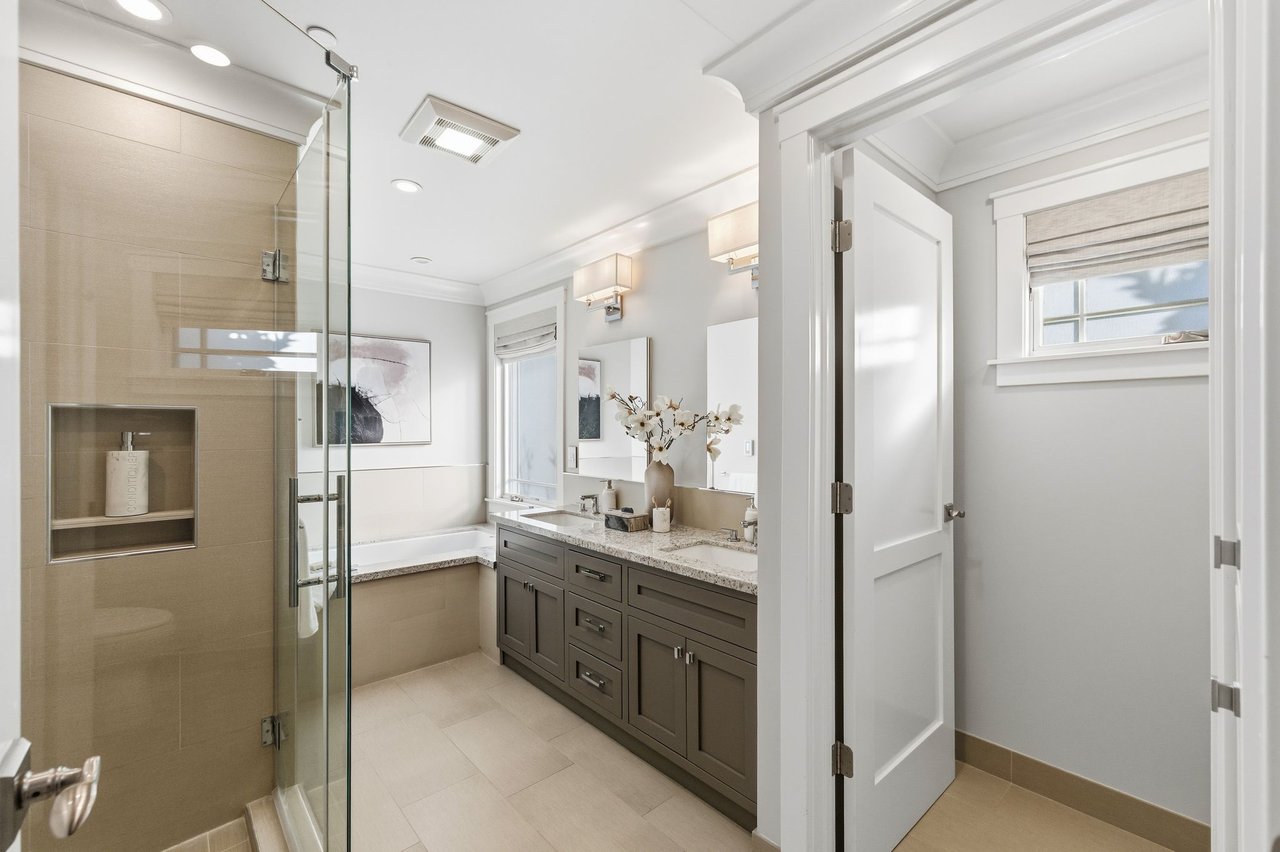 • Primary ensuite with tray ceiling and spa-like bathroom with dual vanities, quartz counters, a soaking tub, and deluxe glass shower