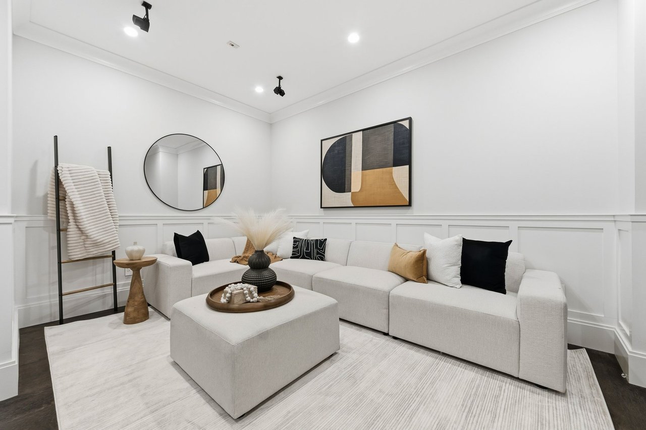 • Bright living room with coffered ceiling and modern gas fireplace with chic stone facade